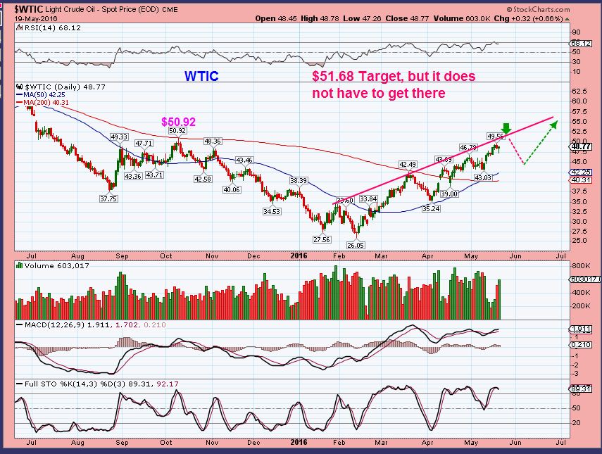 WTIC –  Oil should be nearing it’s 2nd daily cycle high and I projected that to be near $50  ( Actual $51.68) .  I’ve drawn a drop into a DCL, and then a 3rd daily cycle run higher.  In the comments section, I mentioned that UCO and USO  closed their gaps and reversed higher. Very nice looking action.