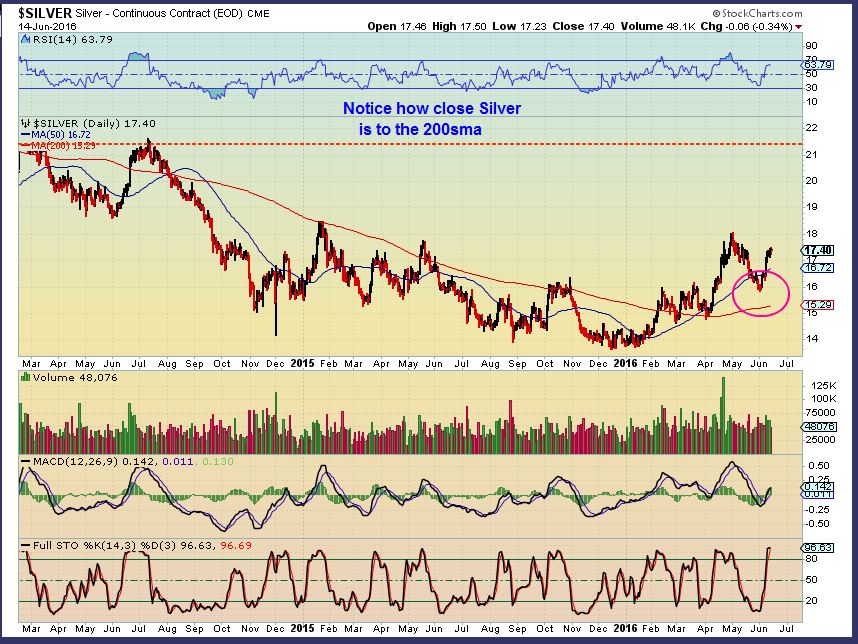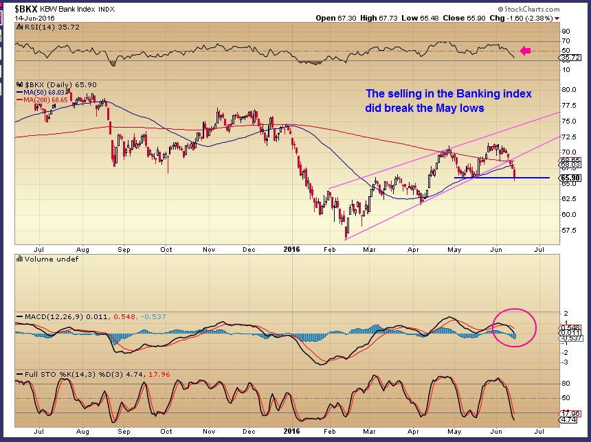 Of course we will know more after today, there are several possibilities, but I am bullish on Precious Metals as I have mentioned in reports over the past 3 weeks now. The General markets are really in a tricky area with the BKX break down. Time will tell, and then comes BREXIT next week 🙂