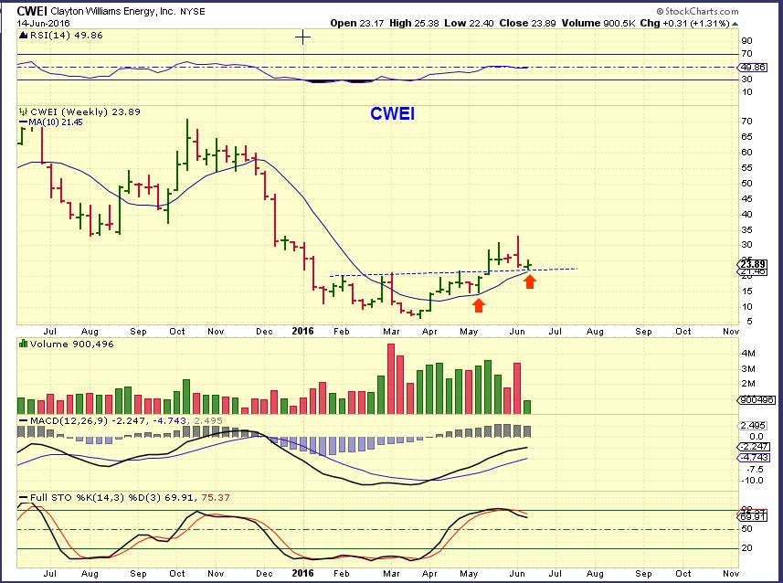 This is the weekly chart of CWEI. We have traded this fast mover in the past and it may be back at support.