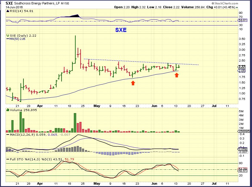 SXE – SXE is not oversold, but it is climbing along the 50sm and may hold up well. It is on my watchlist too. It would be considered ‘a low risk entry” here above the 50sma, but you would have to be willing to honor your stop if it drops below the 50sma.