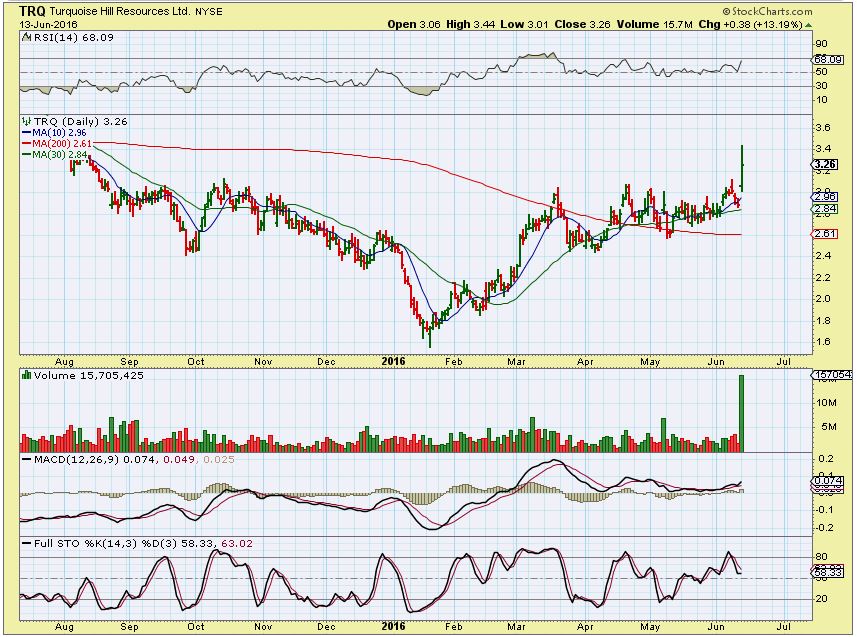 TRQ – This chart was in yesterdays report. The chart showed a bullish high volume break out and is near the 200sma, it ‘only’ doubled from Jan to March .