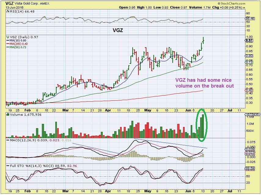 I had pointed out VGZ recently, because it was not extended above the 200sma after this recent consolidation. It was consolidating in the 65 to 90 cent area. Volume was pouring in.