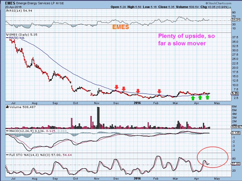 I mentioned that Oil could just go sideways, possibly to the 50sma, and then move higher, rather than dip down into a cycle low (DCL)  that is very noticeable.  I came home yesterday and reviewed some charts and noticed that some of the Energy Picks that I have mentioned in the recent past, have started to move higher again. This COULD possibly indicate that OIL itself will just move higher.