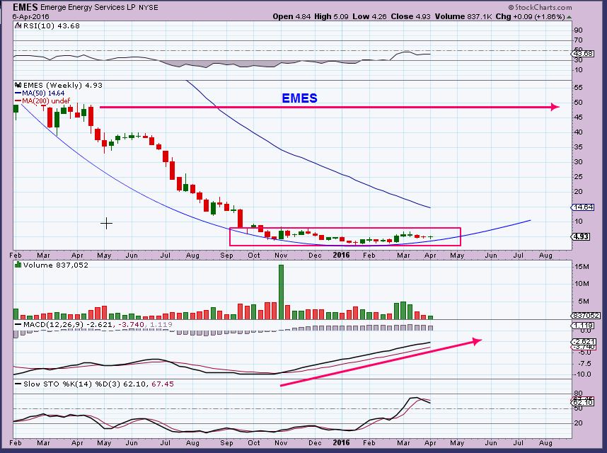 EMES – This was another long Base that I was trading and pointing out here. A $50 stock down at $ 2.50,  it had run to $5.00.
