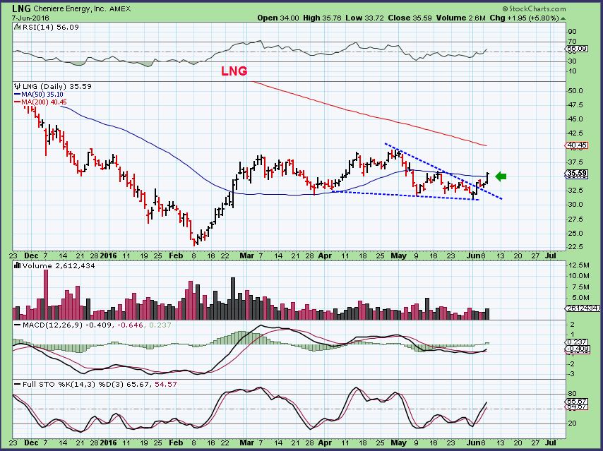 LNG – Breaking above the 50sma. Many Energy stocks are breaking above the 200sma ( See charts above), so this may or may not pause at the 200sma.  Even as a quick trade, $35 to $40 ( 200sma) is a great trade.