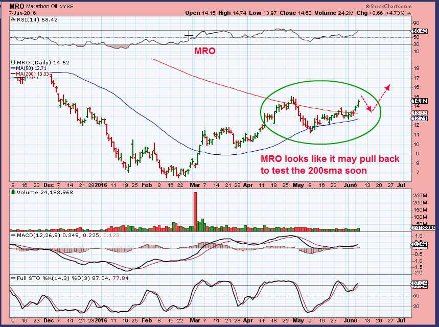 MRO-  Watchlist: This could just keep running, but it looks like it may back test the 200sma, and that could be a good entry.