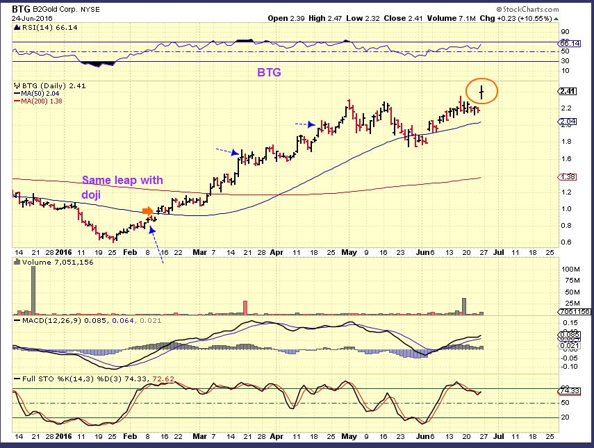 BTG –  I was recommending BTG for the same reasons as Sand (And MUX &VGZ). It now has broken out too, but formed a doji Friday. I will add on a pullback, but it also may just go sideways and higher from here. The arrows point out other dojis on bursts higher, it went sideways and then higher.