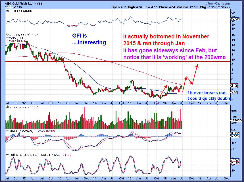 GFI –  I owned this for a while and it was dead money.  It just went sideways for weeks and I got bored with it.  I took a look this weekend and it really is carving out a 2-3 year base.  Recently it has been moving between that 50 & 200 Weekly Moving Averages in a 4+ month consolidation.   When this closes above $5 and above the 200wma, it could move to $10,  so I want it on my watch-list.