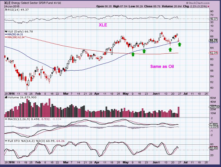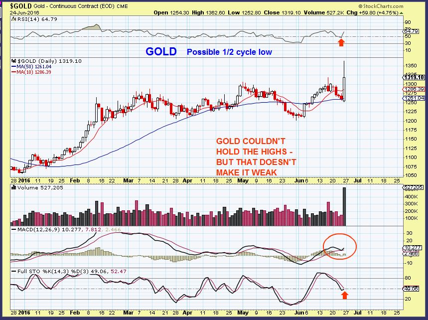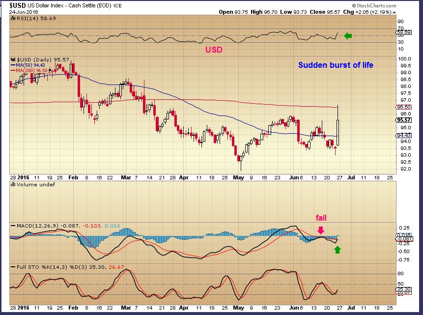 Honestly, in recent reports the $USD was acting so weak that as it rolled over without tagging the 200sma, I did NOT expect it to show enough strength to get there. After the Brexit Vote, it went from 93 to 96 –  Ka-Boom! This now looks like a legitimate sign of strength, and of course we would expect Precious metals to suffer, but we know what happened there. They rejoiced, joined hands, and ran through the fields together (odd).  The USD now looks pretty strong, but I want to wait and see what it does from here.