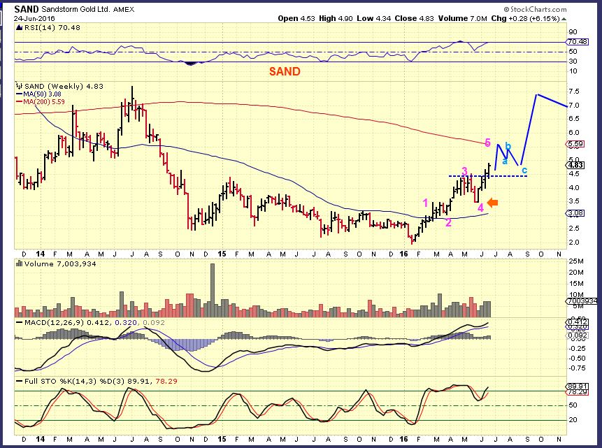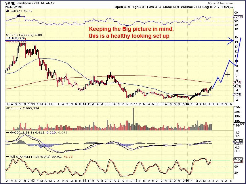 SAND WKLY –  But when you step back and say ” I think Miners are recovering, and are back in a bull market”, you can see that being in it will pay off over time. It should triple plus.