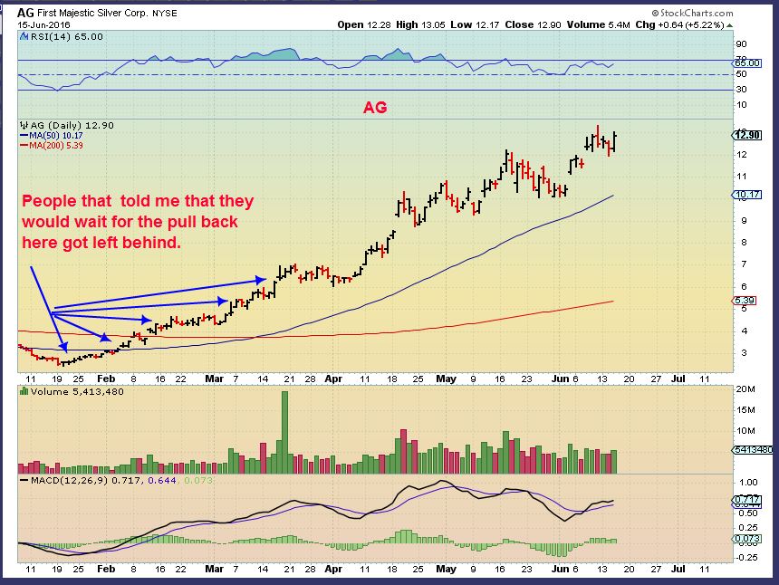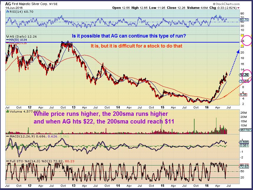 AG – This is almost 300% above the 200sma and looks like it does still want to go higher.  I wrote on the chart that maybe by the time AG hits $22, the 200sma would be at $11.  Then you could get a pull back.