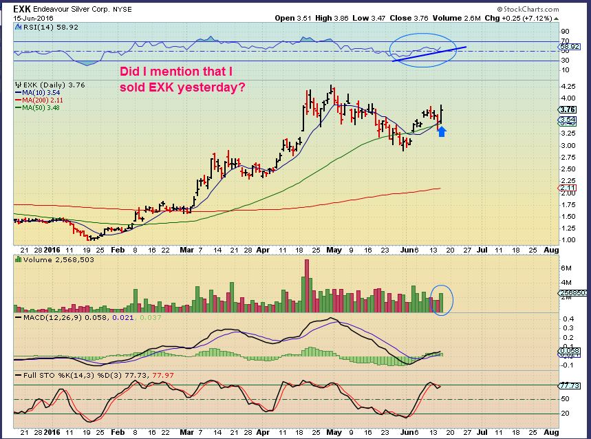 EXK – EXK broke below the 50sma in June and then again 2 days ago. I actually bought it below the 50sma as a back test of the break out and because I thought that the ICL timing was due.  I sold it 2 days ago, and this now looks set up to run.  This looks like a nice set up with another long consolidation like the one in March.  EXK did not extend too far from the 200sma.