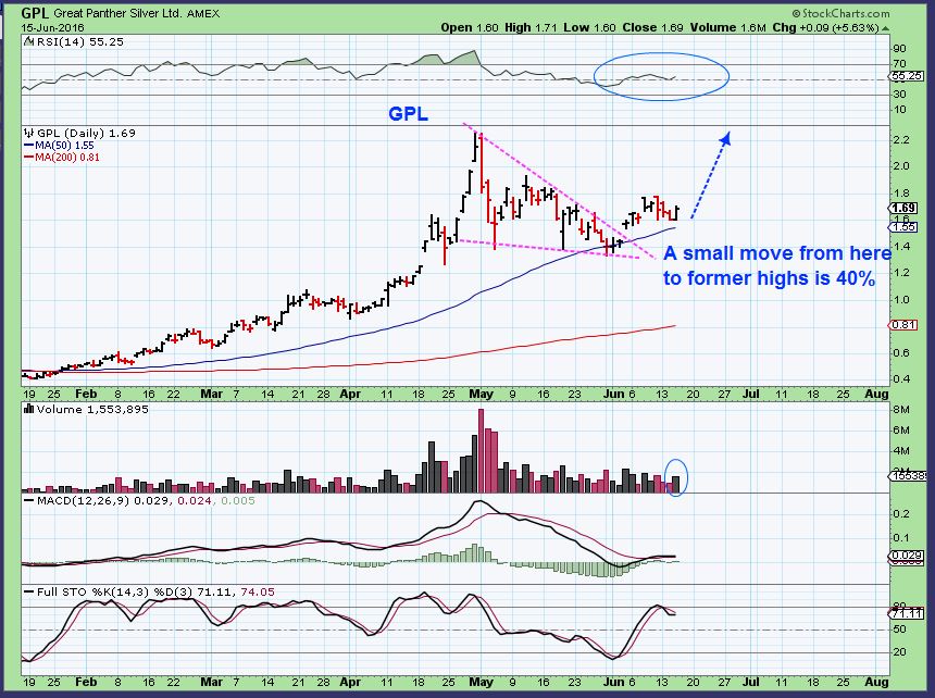 GPL – GPL has had a large consolidation.  GPL IS about 100% above the 200sma, but notice that it was already 350% above the 200sma in late April!  In late April the 200sma was at $0.60 and price was at $2.20! Wow. If GPL simply returns to $2.20, it is still a nice move, but it could probably break the April highs and run a bit too.