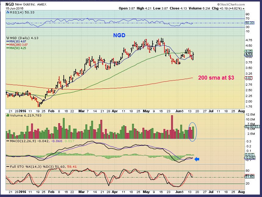 NGD – NDG made a $3 run from the January ICL to May highs. It is still near the 200sma, so if Gold runs higher over the next 2 months, NGD  should be able to move higher before becoming over extended.