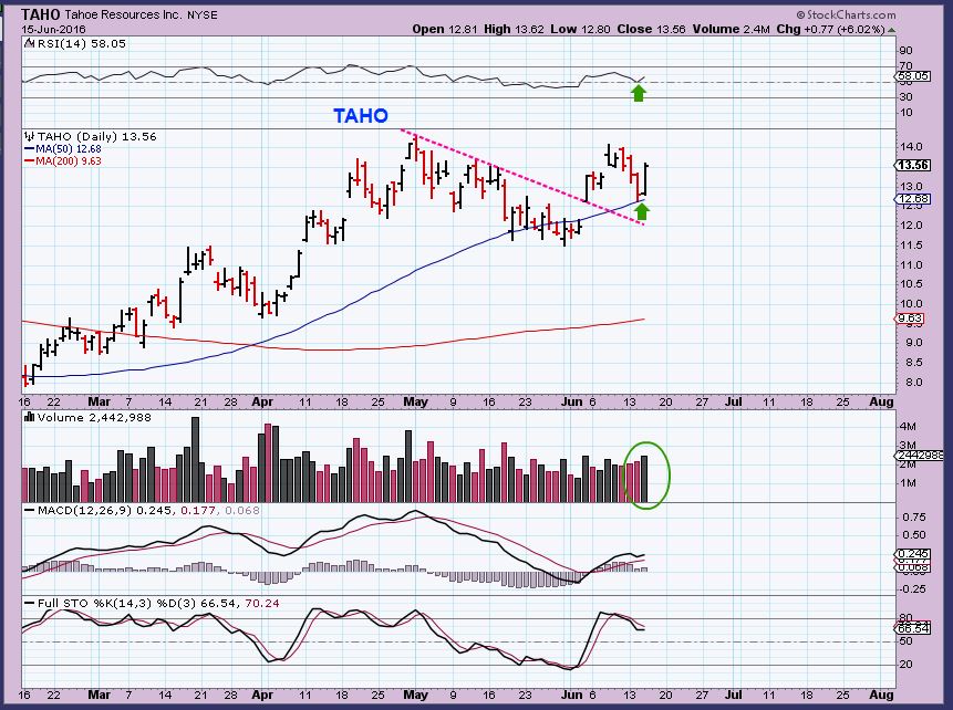 TAHO –  Nice reversal on the 50sma with good volume. For this to run 100% above the 200sma, it could go to the $18-$20 area.