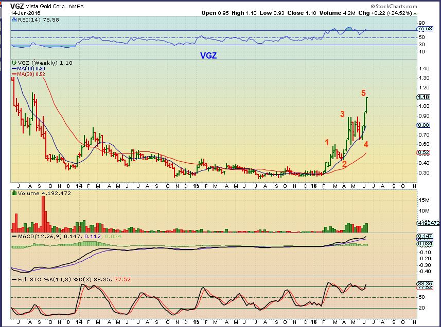 BTG –  VGZ and MUX both moved toward their former highs on increasing volume, and then just exploded.  BTG looks like that now.