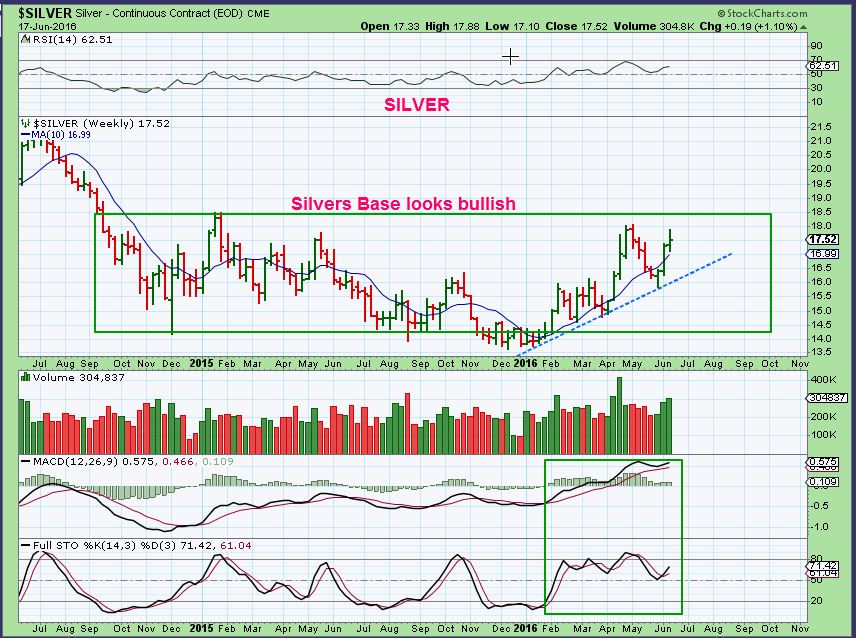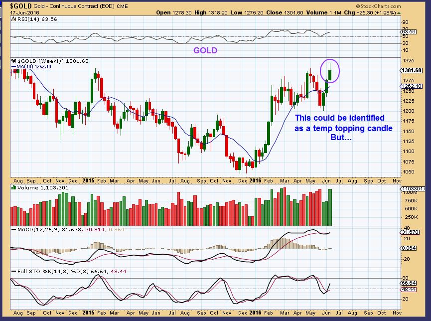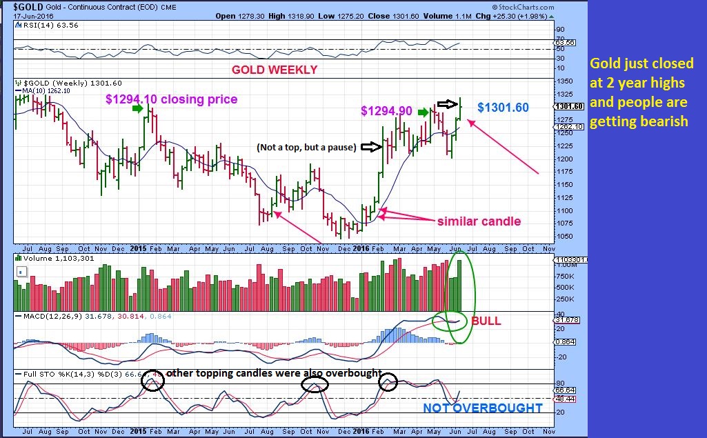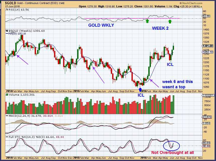 GOLD WKLY – The prior topping candles were at overbought conditions I am thinking that we are coming out of an ICL, not overbought. Gold can pause or maybe go sideways during this Brexit voting week, or may shoot higher an back test on Bexit vote. Either way, I am still bullish.  We also just closed at 2 year highs on a weekly basis, and people are bearish. Gold has been going sideways at the same prices from early Feb 2016. That is a 4 month consolidation. I think it is an illusion to be bearish and believe that GOLD is weak here.