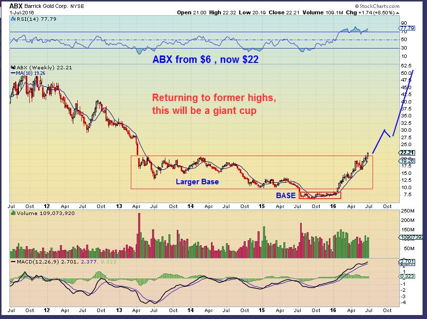 ABX –  Buy & Hold. This is how the base plays out over time. It looks easy to ride, but there were pullbacks that scared some. THIS is why I am serious about some buy & hold positions as these juniors come out of their bases.  ( See also VGZ & MUX for recent examples).