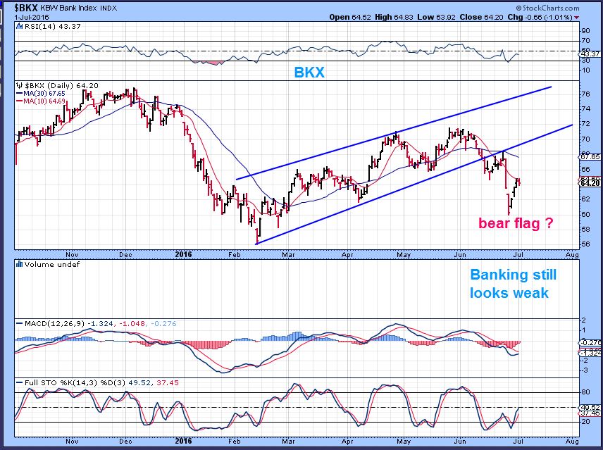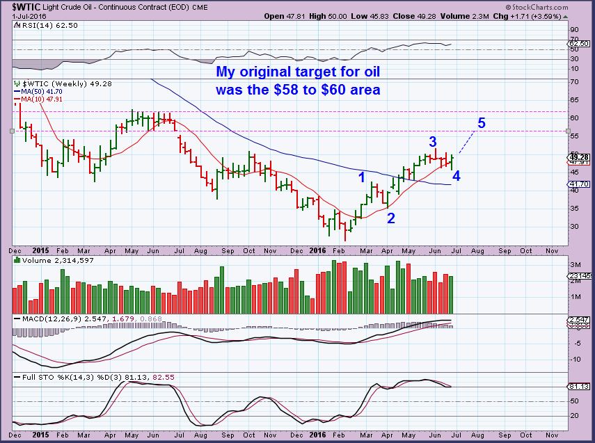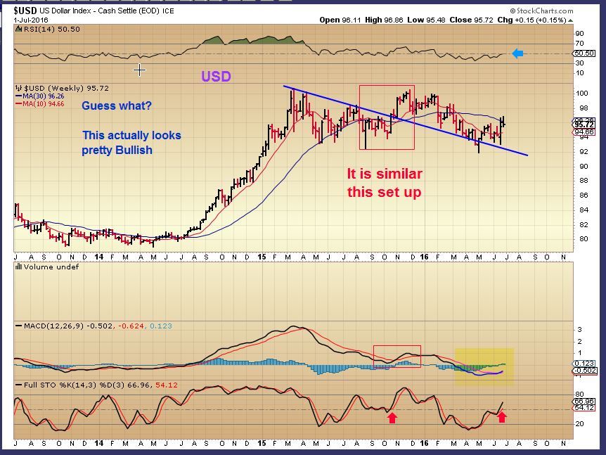 USD – I have been bearish the USD for over a year now and things have played out very much like I expected.  After BREXIT,  the USD strengthened  ( and so did Gold).  So I am not concerned for Gold, but I’m interested in watching how this plays out for the $USD. It is short term bullish, but is it longer term bullish too?