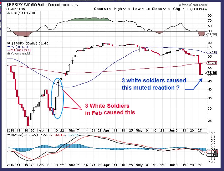 I dont know exactly what this means at this point, but I look at a few different things at turning points, and the $BPSPX is seriously not responding to the recent surge higher the way it did in February when we had the other 3 white soldier pattern.  It has me a bit cautious.  This was Thursday,  you should look it up & see what happened Friday  🙂