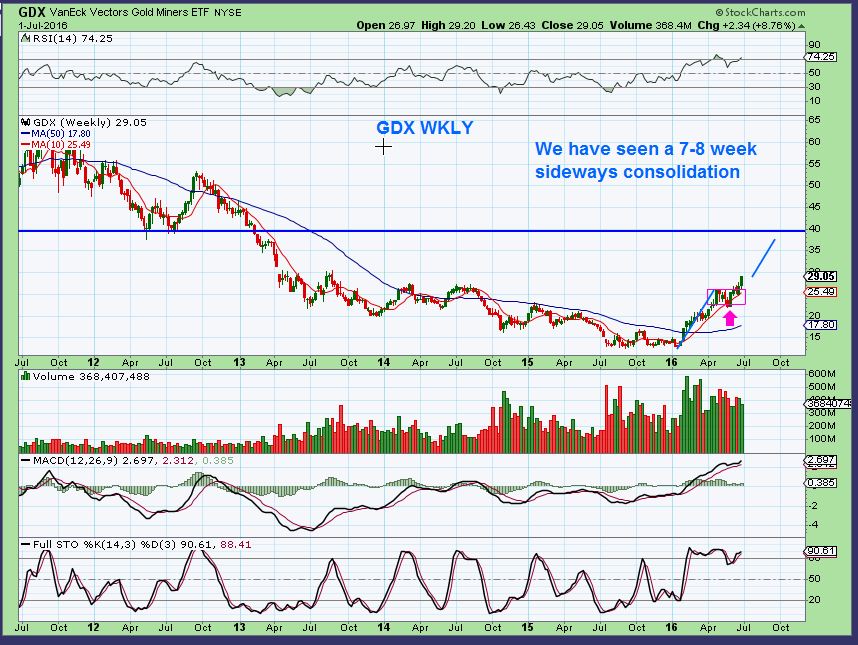 GDX WKLY – BULLISH consolidation and break out. First target $30, but if it breaks higher, this targets overhead resistance near $40!