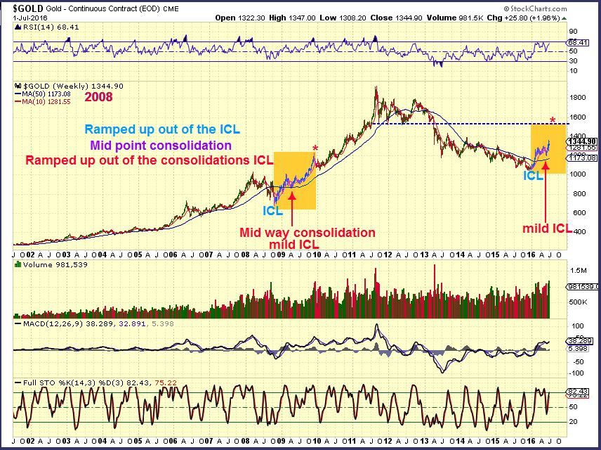 GOLD WEEKLY– Let me compare the move out of the 2008s ICL with our 2015-2016 run.  The first run was pretty much straight up, then a sideways consolidation for weeks, and the second run was a tad wavy, but eventually spiked at the top. I still say we’ll easily run to $1400+, but could tag resistance at $1500+.  Read the chart.