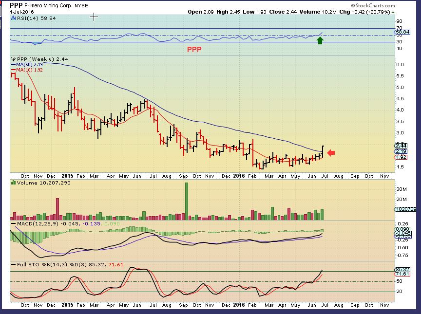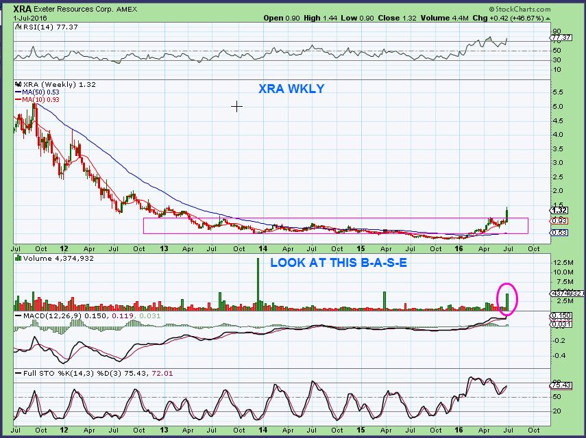 June 28th – This is a great base. I was comparing XRA and TRX bases in a prior report. This is why I want to encourage a possible ‘buy & hold’ core strategy. Some cannot stomach the ride, but if TRX forms the CUP and is at $5 in the future, you’ll be glad that you did. With GOLD at $1500- these Miners bottom line will improve quarter over quarter. Gold at $3000 an these Juniors will be huge gainers!