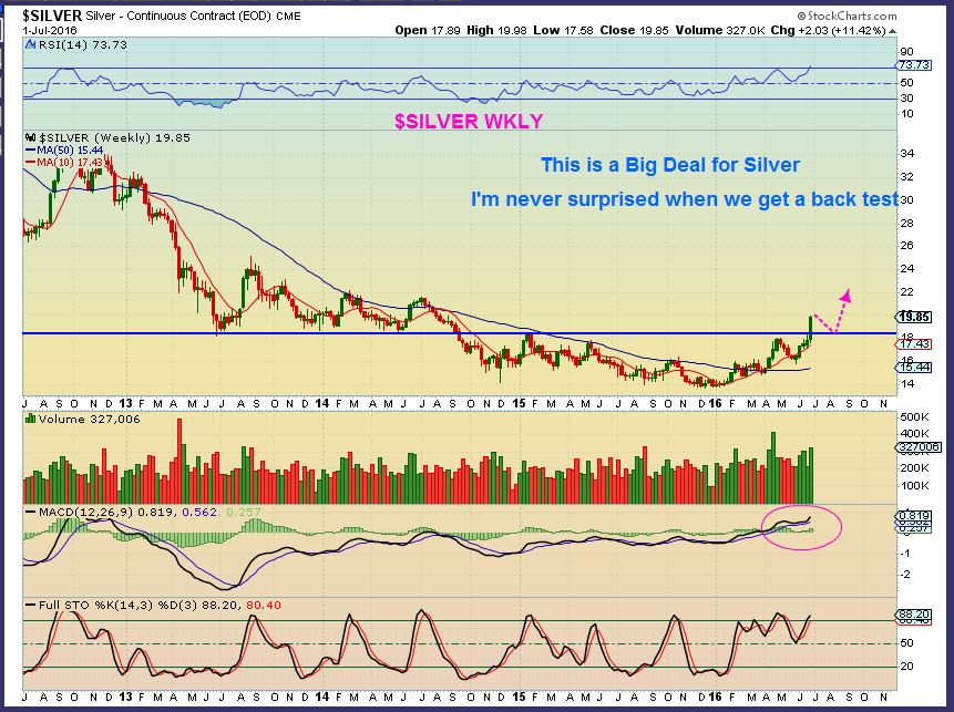 SILVER WKLY –  We’ve been waiting for this. Silver has a strong Base in place. Silver is at almost 2 yr highs, that is a big deal. We could get a back test this week, but we dont have to.