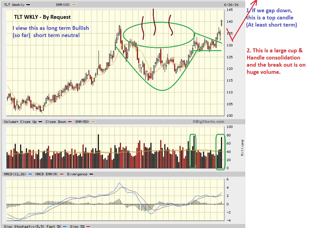 TLT WKLY – With a weekly gap higher, there is a chance that this could gap lower and leave a topping candle, but this looks like a valid Cup & Handle Break  out to me longer term.
