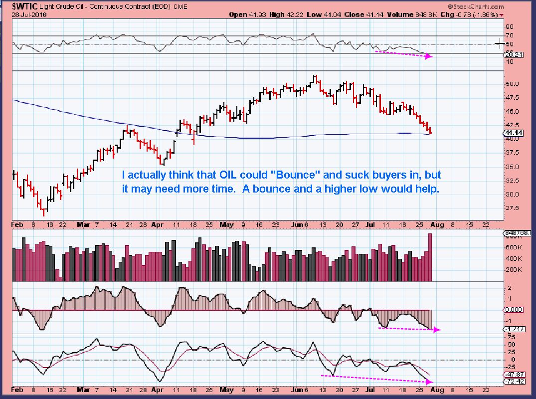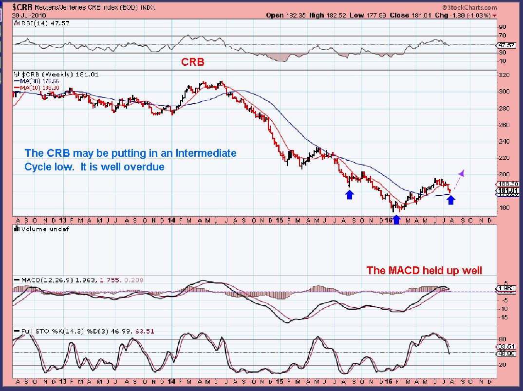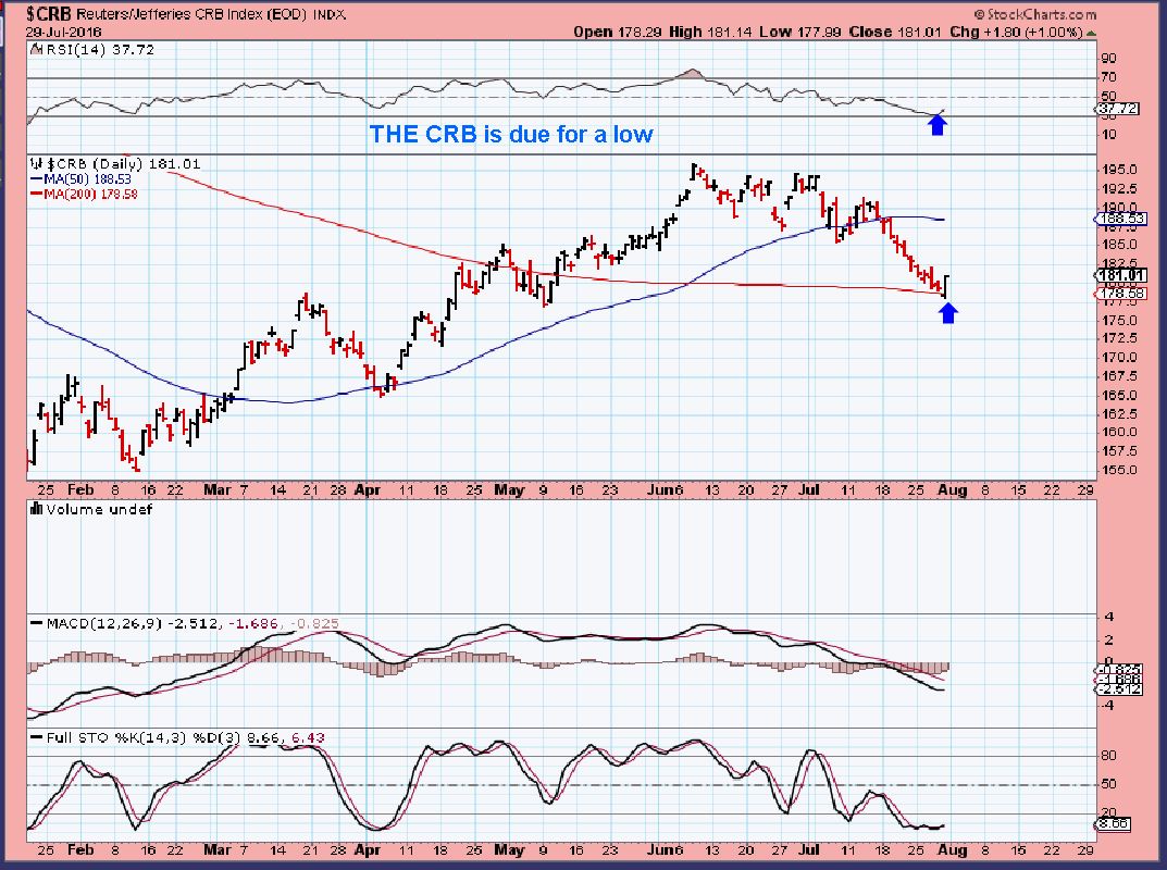 Could OIL just bounce and then double bottom / shake out? Yes because it is early in the daily cycle ( Day 29, thats NOT too early so it could bottom right here, but we’ve seen 50 day daily cycles in Oil) and I dont see any divergences yet. SO this may be THE low forming, or a bounce and a low. We are Close – I.M.H.O. The CRB hints at that.