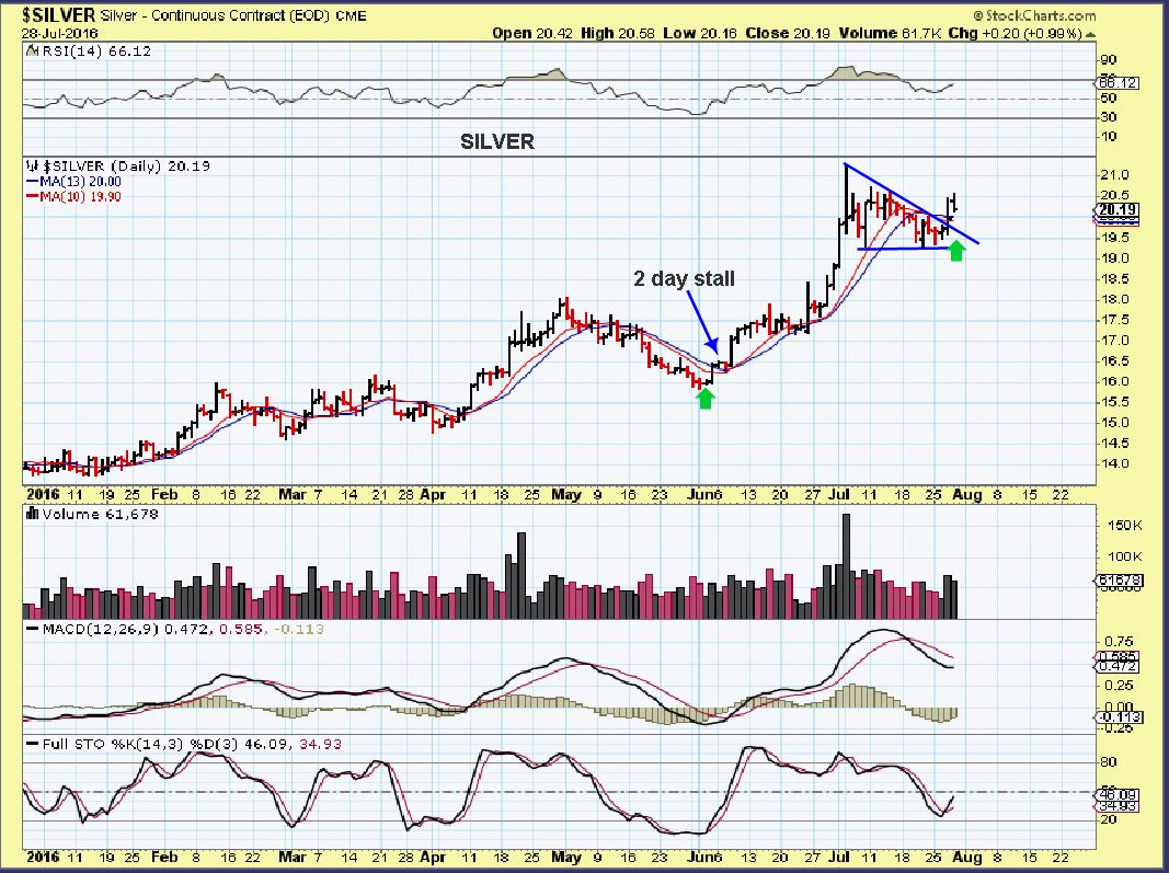 SILVER – I pointed out the bullish break out from this pattern, and the stall Thursday means nothing as long as those lows hold.