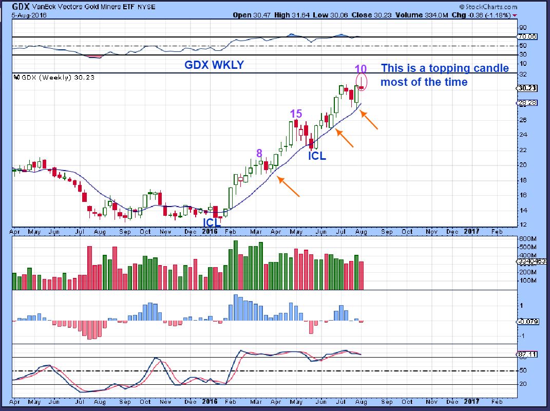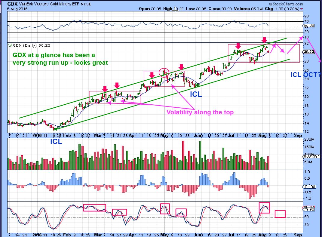Here you can see that GDX is pushing on the top of the rising price channel, and this often causes volatility.