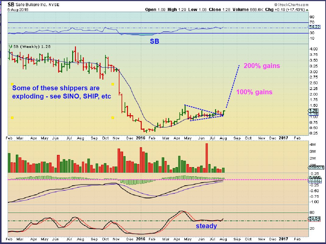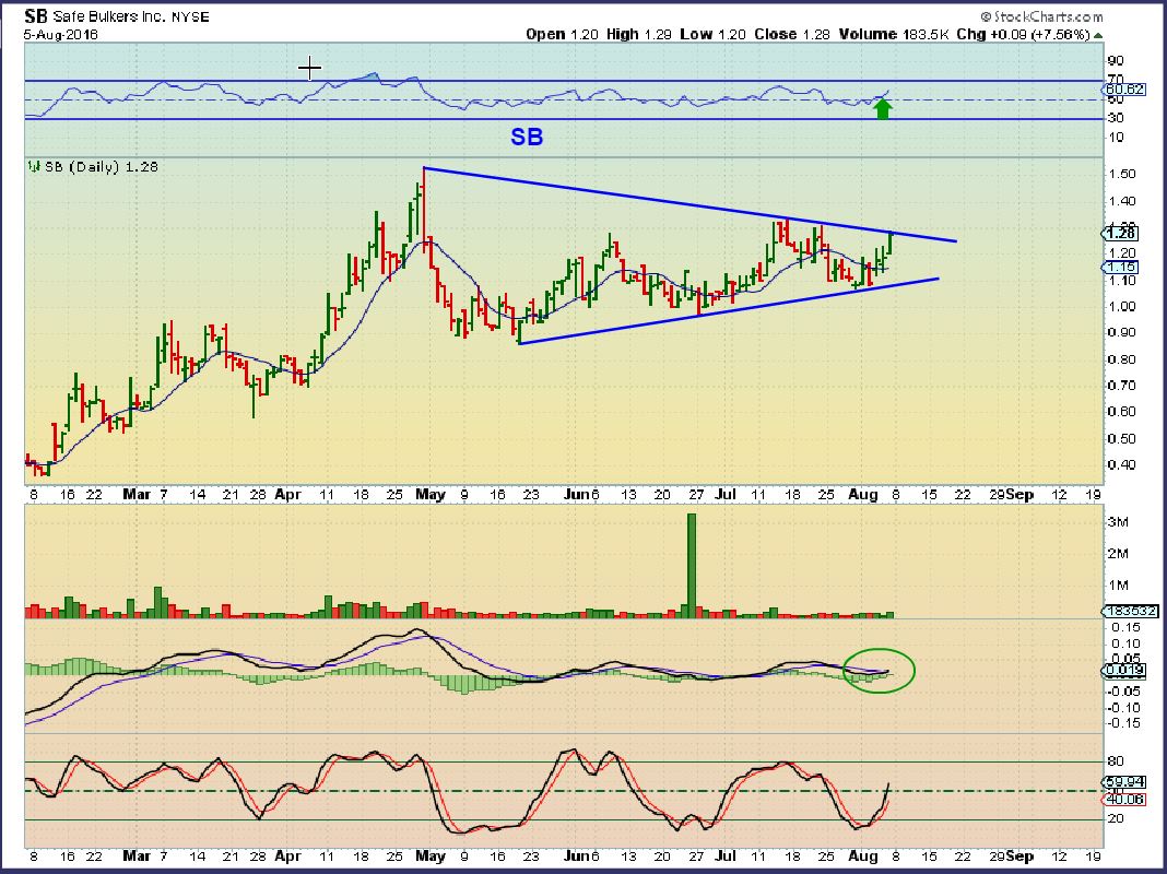 Look up SINO, SHIP and you’ll see they’ve popped 45% and 145%.  These are not without risk, the sector can be very volatile, so I plan on mentioning it here for active experienced traders,  and I will keep an eye on it for set ups that others may want to take in time, after they prove themselves.  I do like these set ups and will likely buy SB as it works around that triangle pattern  (Stop below the apex).
