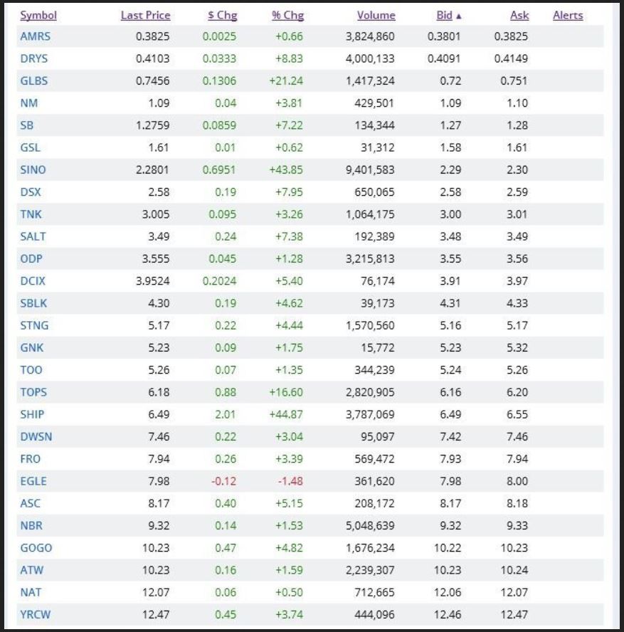SHIPPERS may be bottoming too.  I mentioned this in the chat section Friday . I have seen  MANY shippers put out earnings, and break out upside. That is a positive. I posted this list of shippers for those that want to look up their charts. I will post a couple below. ( AMRS and ODP  are not shippers, I dont know how they got into my list).