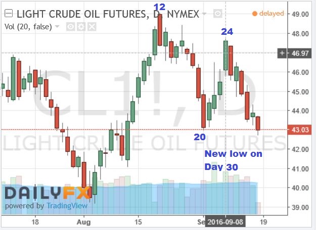 I posted this chart before to show that we did get a new low on day 30, which was Sept 16th. For some reason, Stockcharts doesn’t show a new low on that day, but other charts do. That allows for a DCL on the 16th.