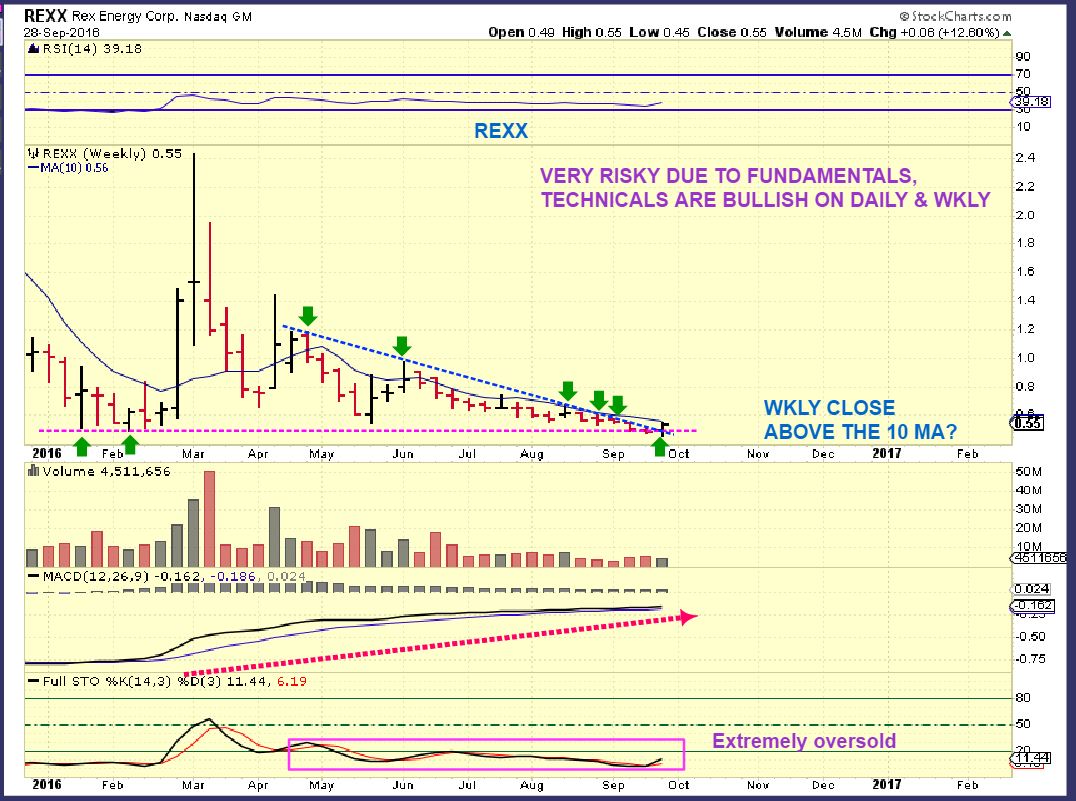 REXX– Again, risky but still in business and breaking out from a weekly triangle double bottom low 🙂