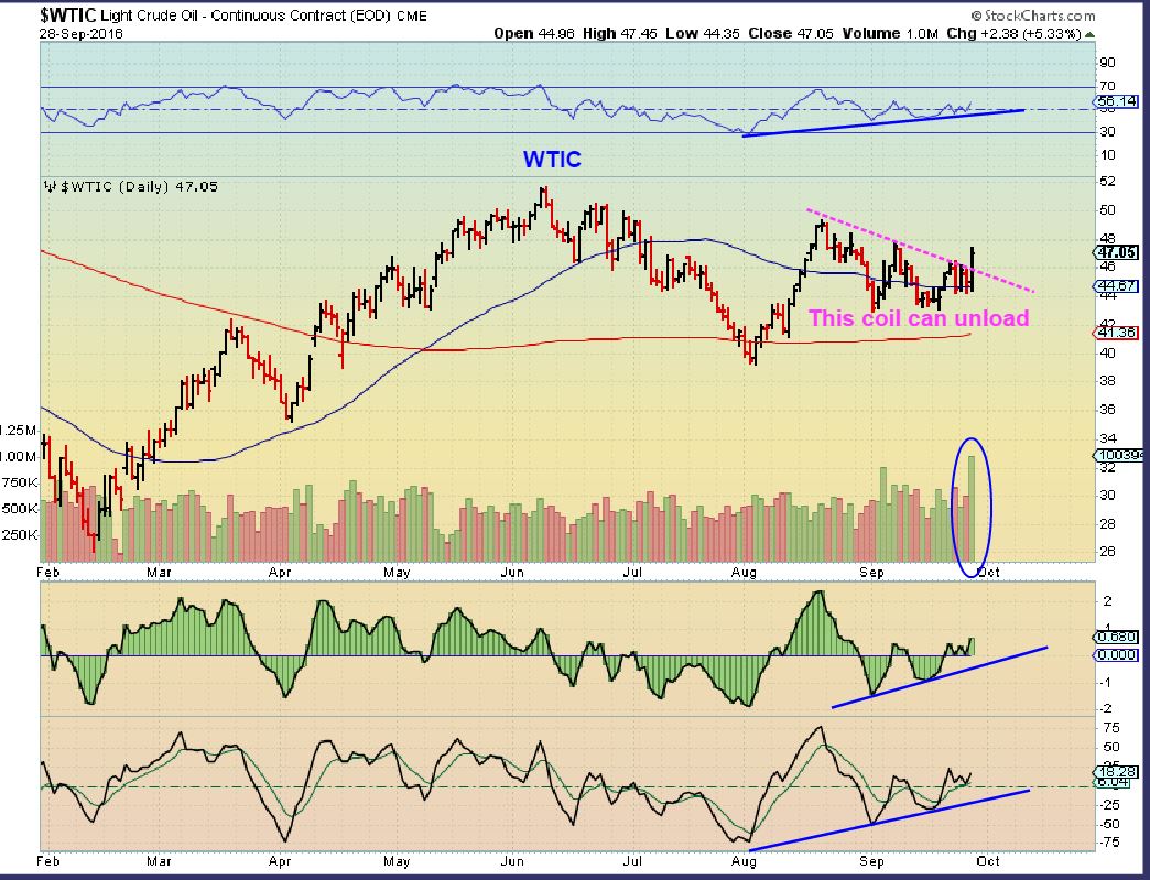 So again, after coiling and building energy in this sideways move, Oil can run higher in a big way, especially if no one believes it. I have read tonight that plenty do not believe this move. This chart and the indicators are bullish.