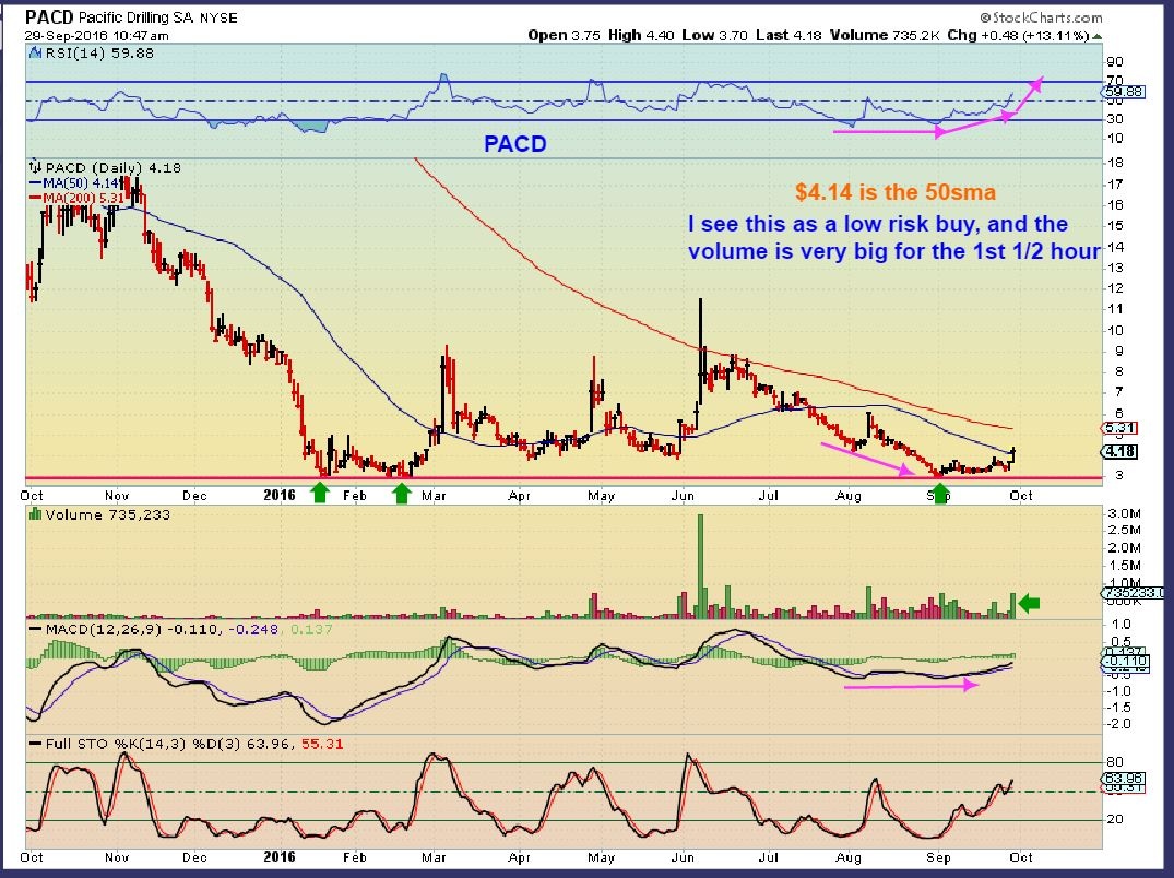 PACD has very strong volume today and has been lingering near the lows, I like it here. I own it as of this morning and may add if we get that mid day pull back. The June run up did a $4 to $24 run, but it has also done a reverse split. Reverse splits didnt hurt NADL,SGY, REN, etc performance on the last run higher.