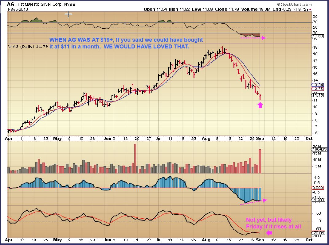 HMY – A strong 11% day. You could say this triggered falsely  on the 27th, but price made up for it today, by closing above that price.  So if JOBS REPORT knocks the GDX down, I would expect that to become a final low and GDX would probably look like this next week.