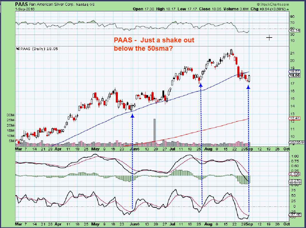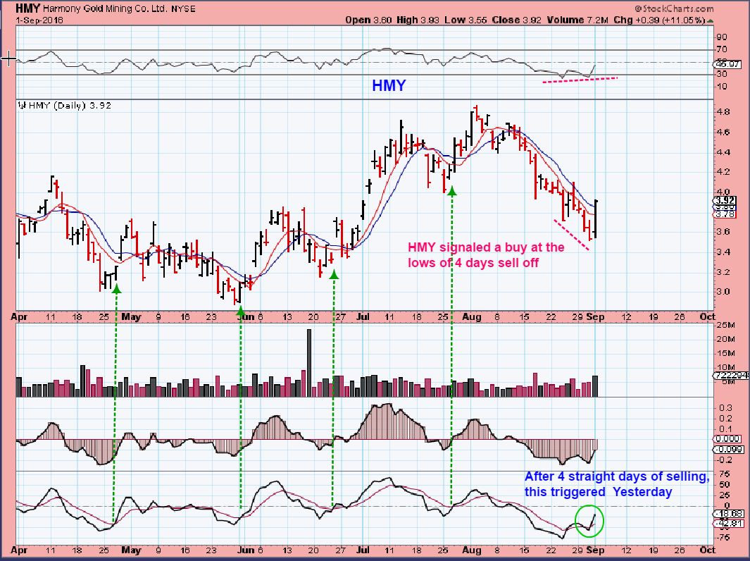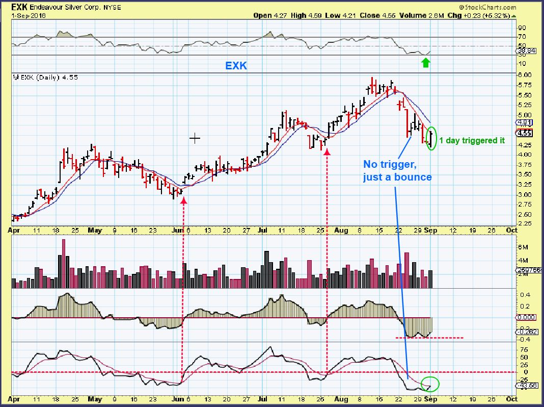 EXK –  Using those indicators on individual Miners charts, I found that many triggered Thursday too.  This was on the first day of the reversal. Often it triggers on the 2nd or 3rd day, yet still with price below the 10sma.