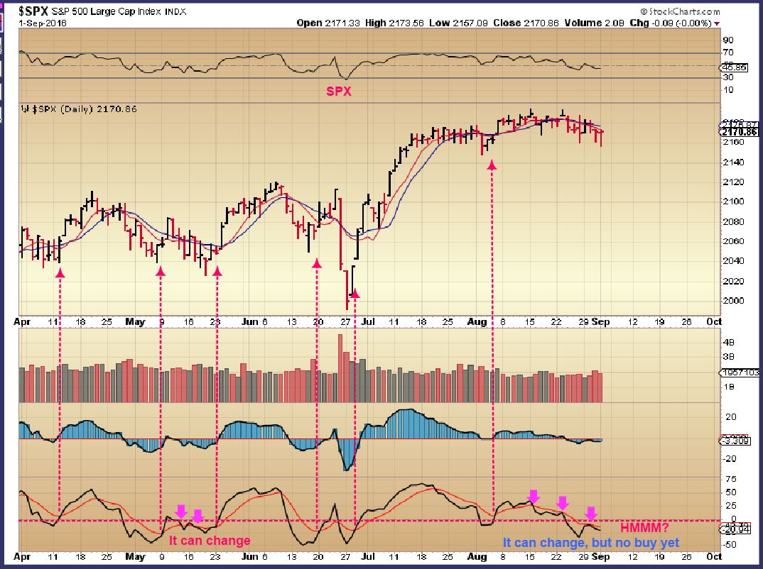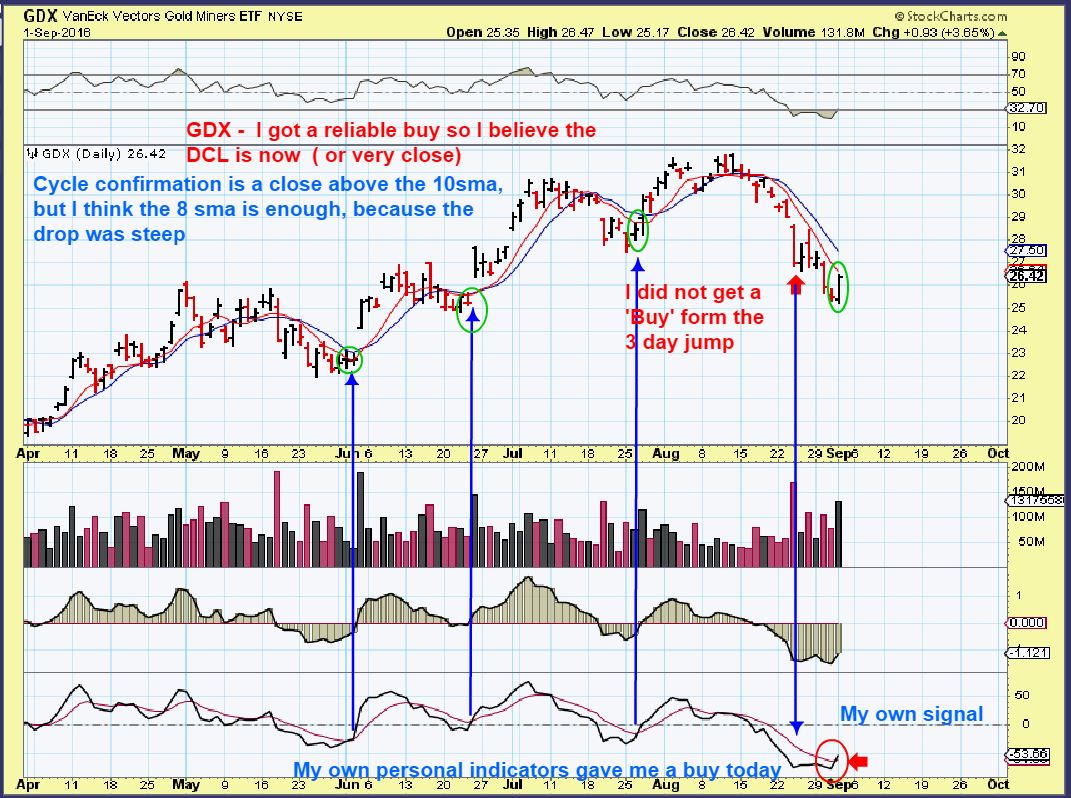 GDX – I have shown this set of indicators that I developed for myself in the past.  It triggered a buy today, and using these indicators, it always triggers at the bottom of an ICL or DCL within days, but rarely triggers early.  With a 1 day reversal, it triggered the buy Thursday. The timing is right cycle wise too.  Notice that it did NOT trigger a false buy last week on the 3 day temporary bottom ( red arrow).