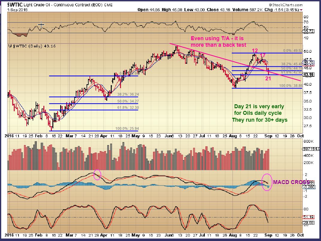 WTIC – I will admit that I am a bit disappointed at OILS deep drop. Good News: Many Energy stocks are still holding up, and several remained GREEN Thursday, while OIL looked like this.  ( See RICE, MRO, WPX, ECA, AREX, etc etc ).  This chart isn’t  just a back test of a break out, and day 21 seems way too early for a dcl in oil.   CAN the 61.8% retrace offer support?  I am not OVERLY CONCERNED.  I own a few Energy stocks, and they are holding up.  I am watching oil, but as an ICL in early August,  this should not continue to break down.  I WILL HAVE MORE IN THE WEEKEND REPORT. I expect the pattern of higher lows to remain.
