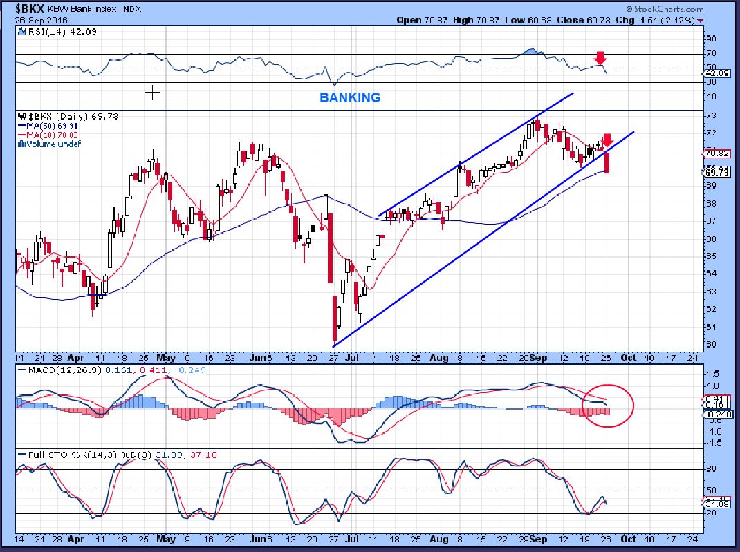 BKX – Banking. This also looks quite bearish all of a sudden, since it broke the Sept 12th lows. This set up is bearish in my opinion. This adds to my cautionary note about the SPX, even though the SPX hasn’t violated anything yet.
