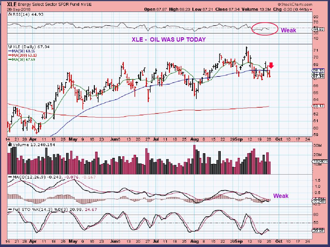 XLE – The XLE ( And quite a few of the energy stocks that I follow dropped. Red) . XLE is below the 50sma and lost the 10sma today. That was with OIL up 3.26% ??