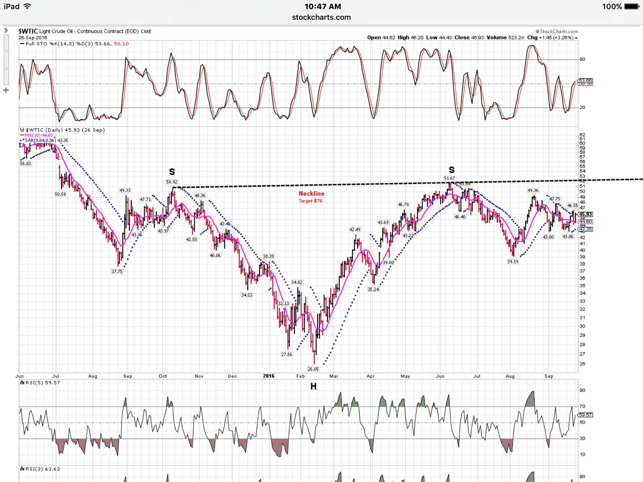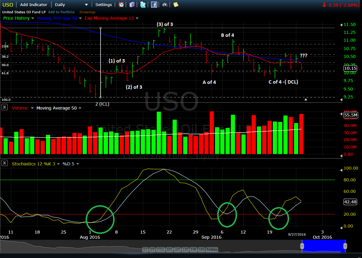 F5! Not really sure – I need to have 5 counts up but I only see 3 on the daily (I could break into lower time frame and try again) so that is incorrect as show, but I show where I thought the DCL was. This could also maybe an irregular flat for the 4? AFTER I snapped the chart, I now see a triangle forming if you connect the 8 Sep high to the next two high green candle (through yesterday) and then connect 20 Sep and today. It would at USO $10.30 very soon – likely this week. I can update with that if this is too hard to follow. Are you still looking for near term bottom? The other issue is if we have a Wave 5 – going off of the Feb final bottom theory then we’re unlikely to have a large breakout above the inverse neckline in the near future. Constructive comments appreciated! 🙂