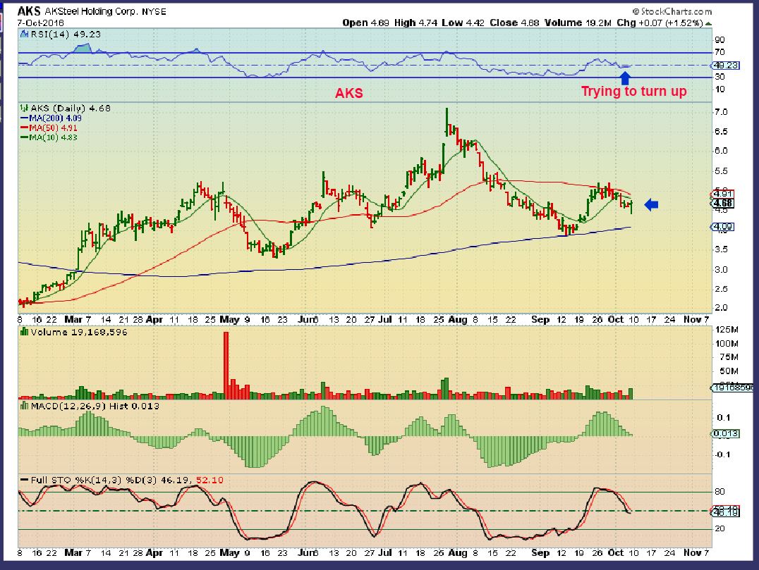 AKS –  THIS LOOKS LIKE THE TWIN CHART OF X.  By looking at another steel company, we see that it sold off Friday and then reversed back higher.  The RSI looks like it may want to turn up, and so AKS is also dealing with the 50and 10sma as resistance, but lets see if it can break out higher.  If so, that gives us confidence that X may do the same, since the charts are similar.