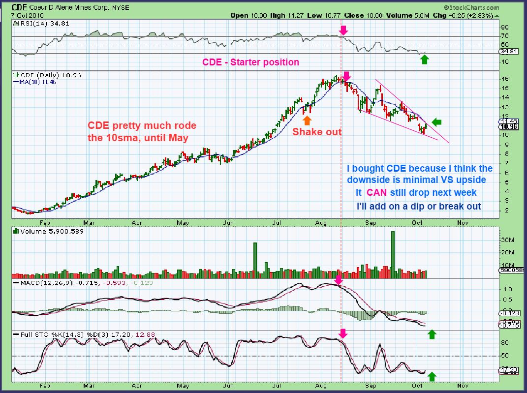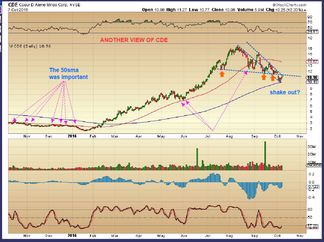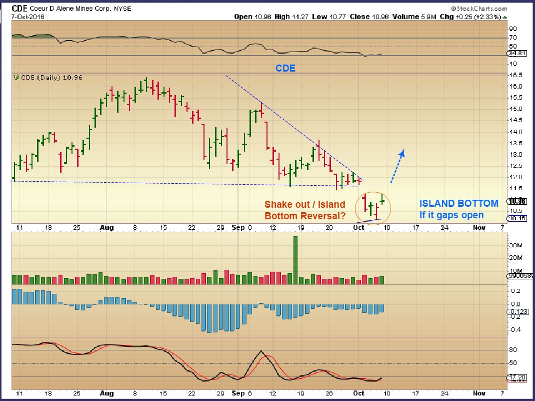 I am a trader and that is how I make a living,  and we have others here that are experienced traders, so we all have to trade according to our own experience and confidence level.  I know that I am talking to at least 2 different groups of traders in my reports, so please know which group you fall into.   YOU WILL NOT MISS THE MOVE if an ICL gets put in place next week and you are in cash, Miners will rally for Months and you will do well.  Even if we had another daily cycle leading into an ICL in November  ( Less likely in my opinion – I am 90% certain that this will be an ICL), it is still going to be a great time to make money ahead.  This is why I have started to add to set ups that look good to me Friday.  If CDE drops further, I will add after it drops and reverses.  If it takes off and just runs higher,  I will add there too, confident that the entry was correct.  For the next few weeks, but I will NOT use tight stops, I will monitor positions.  I will discuss these ideas further as we go forward and things become confirmed.