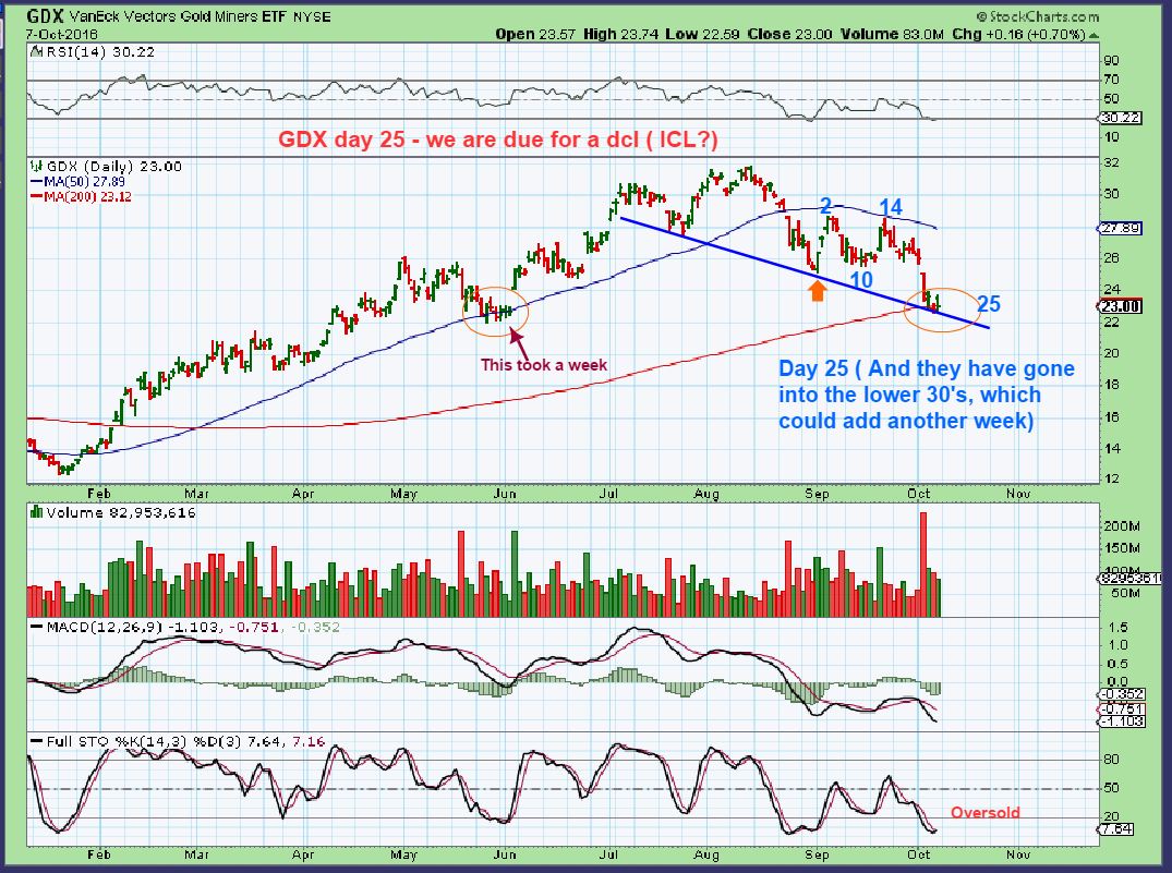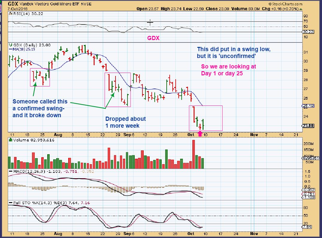 GDX –  Please notice: We do not have a Confirmed Swing Low in place.  I got emails asking am I buying leverage now that we had ‘the confirmed swing low’ in place for GDX.   Notice on this chart that just because there is a Swing in price,  that doesn’t mean it is a confirmed final low and that it will not roll over. Buying every swing with a tight stop will frustrate traders, since one could get stopped out if a stop is too tight.   I will discuss at the end of this report that we should be very close to our lows and if I am adding to Miners here, I do NOT use tight stops on day 25  ( I will use mental stops and monitor positions). Even a dead cat bounce later will get price back higher than this point.