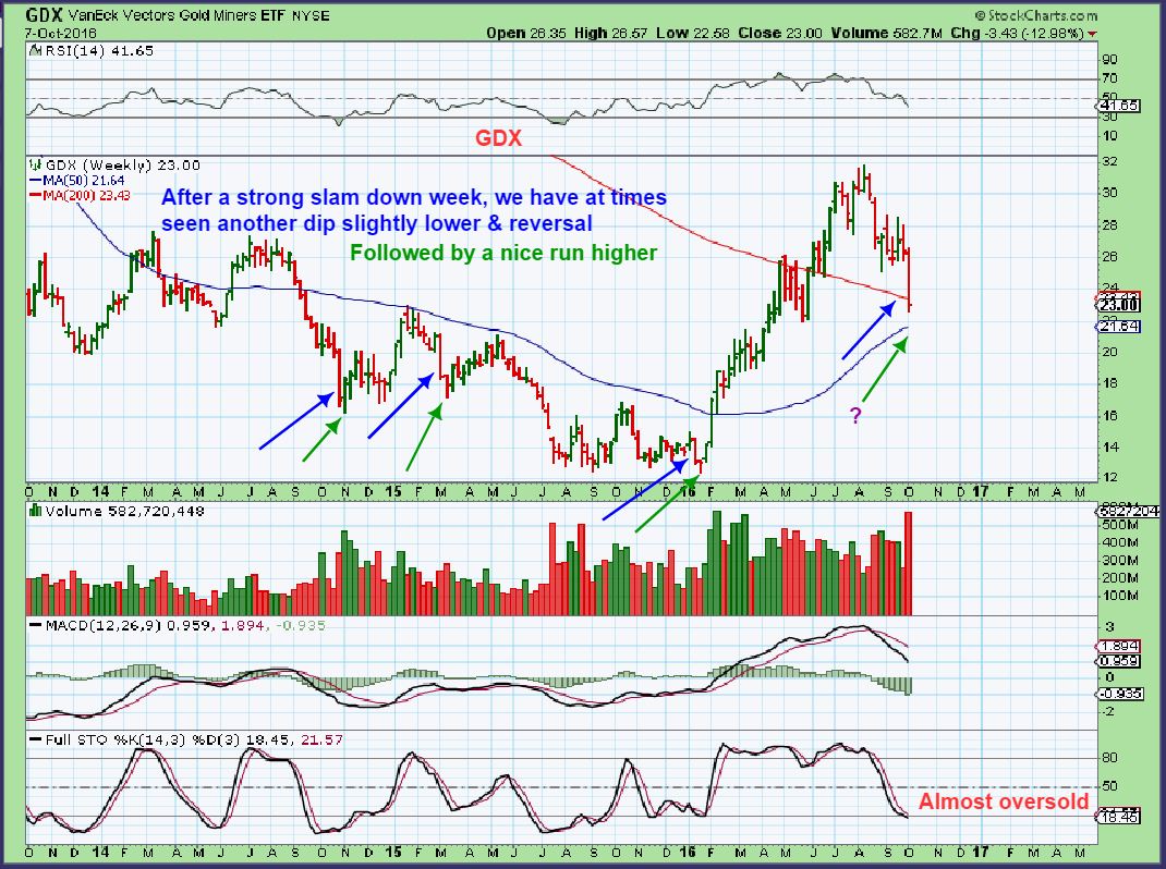 GDX – One more small dip this week?   Maybe. Please read the charts. THE lows may or may not be in, next well will make that clear.