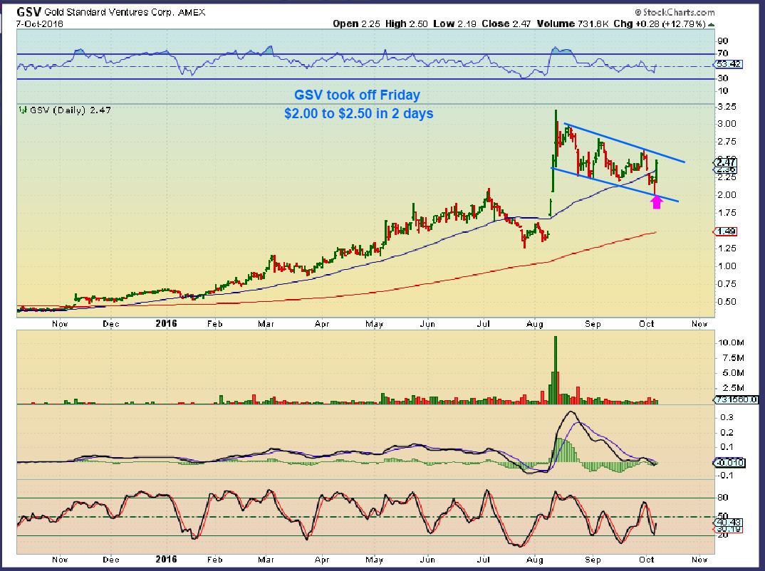 GSV – GSV took off upside Friday and was up 13%.  It ran from $2 to $2.50 in 2 days now. When Gold is finishing up a sell off and some Miners start moving upside, it’s a good sign.
